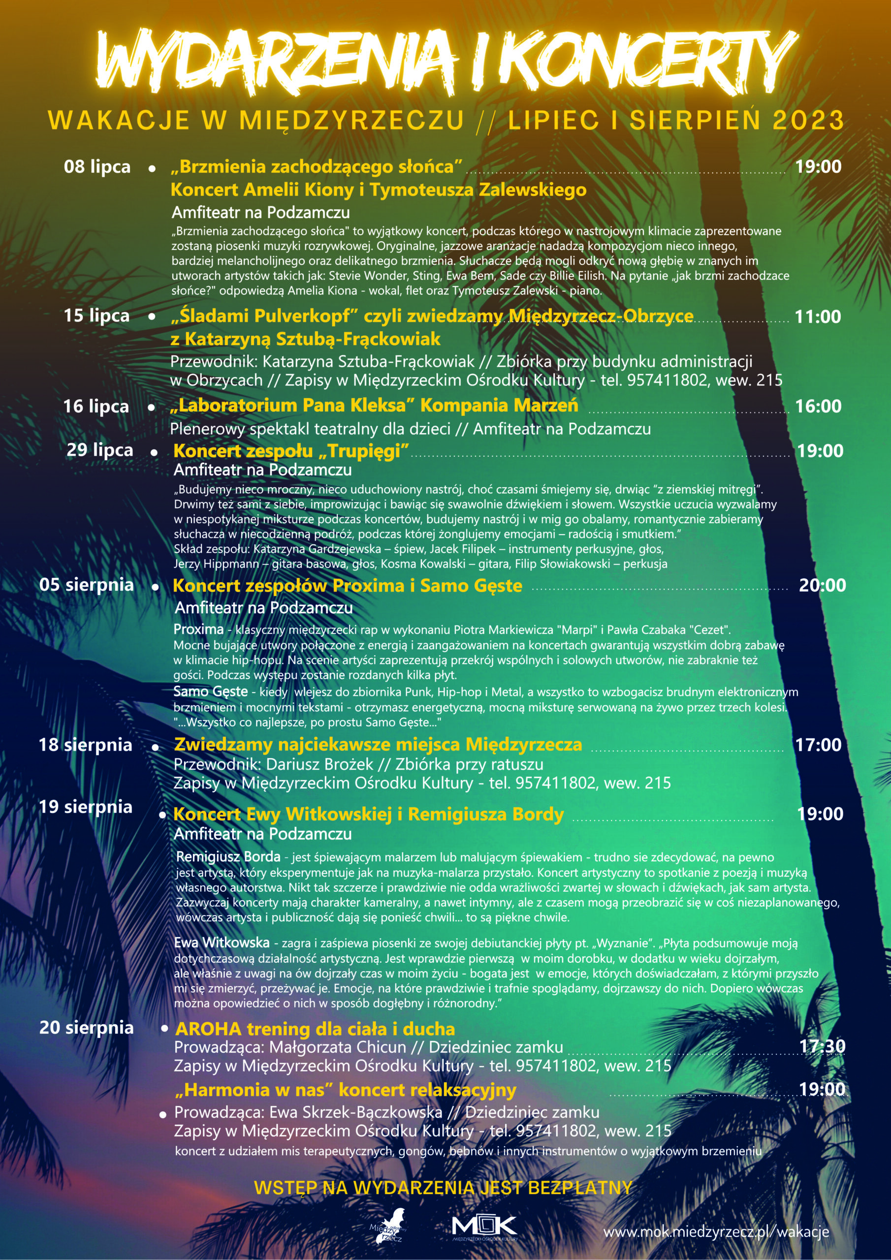 Wydarzenia i koncerty // lipiec i sierpień 2023 Kochani! Mamy już dla Was plan na tegoroczne wakacje! Sprawdźcie co przygotowaliśmy, wpiszcie w swoje kalendarze i widzimy się niebawem Wstęp na wszystkie wydarzenia jest bezpłatny. Do zobaczenia! Paulina Kołodziej2023-06-22T10:41:42+02:00 Udostępnij! FacebookXWhatsAppEmail